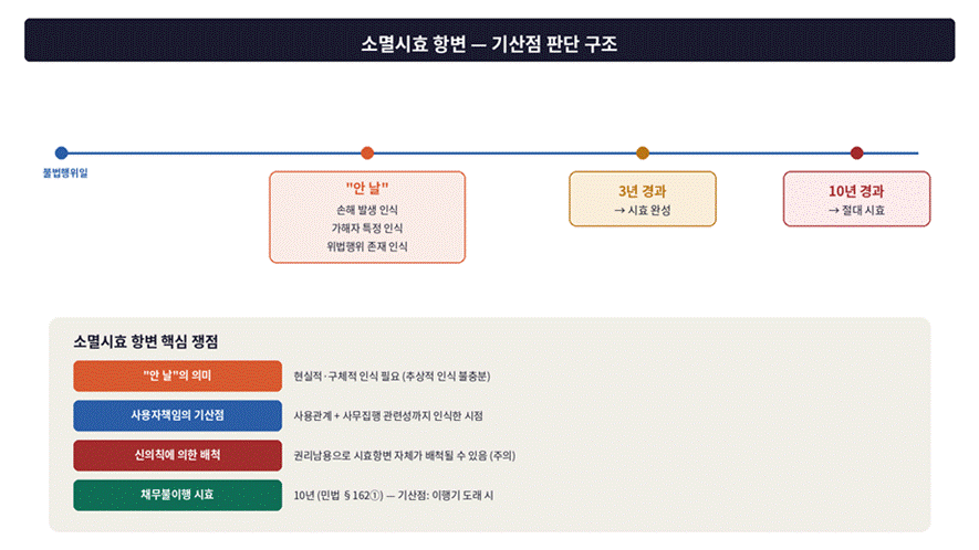 불법행위 손해배상청구권은 피해자가 손해 및 가해자를 안 날로부터 3년, 불법행위일로부터 10년의 소멸시효에 걸립니다(민법 제766조). 여기서 “안 날”이란 손해의 발생, 위법한 가해행위의 존재, 가해자가 누구인지를 현실적·구체적으로 인식한 날을 의미하며, 사용자책임 등에서는 사용관계 및 사무집행 관련성까지 일반인이 판단 가능한 정도로 인식한 시점이 기준이 됩니다.