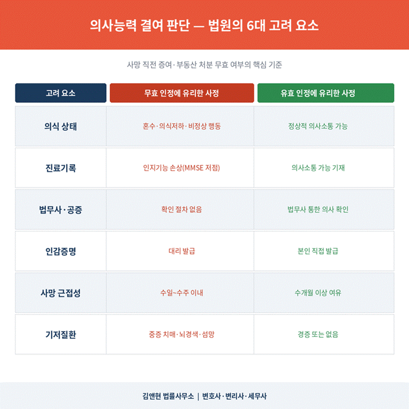 위 내용은 사망 직전 부동산 처분 및 증여의 효력에 관한 일반적인 법리와 판례를 정리한 것입니다. 귀하의 구체적 사안에 동일하게 적용되는지는 증여계약의 경위, 당시 의료기록, 등기 경과 등 사실관계에 대한 면밀한 검토가 필요합니다.