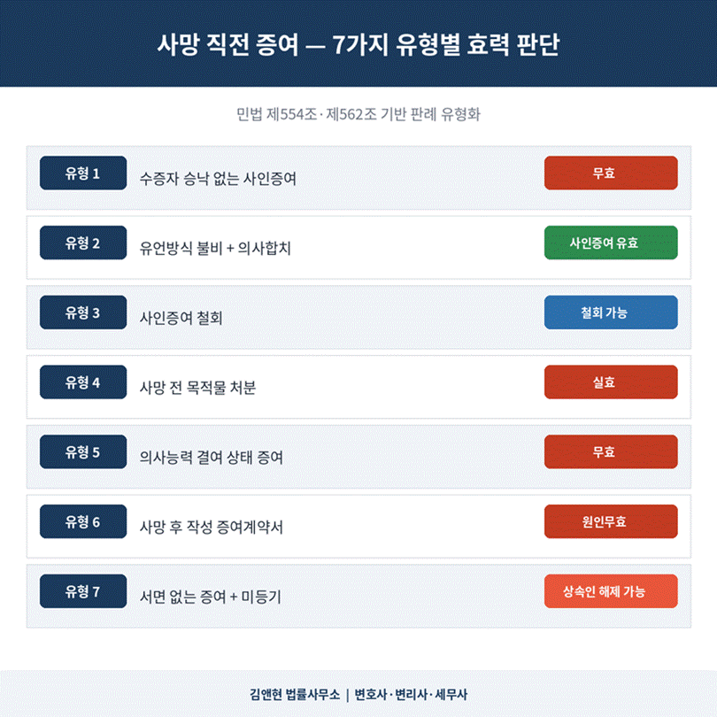 ✅ 5. 사인증여·유증·생전증여 구별 — 법적 성격에 따라 적용 법리와 공격방어방법이 달라짐 (전문가 확인 필수)
