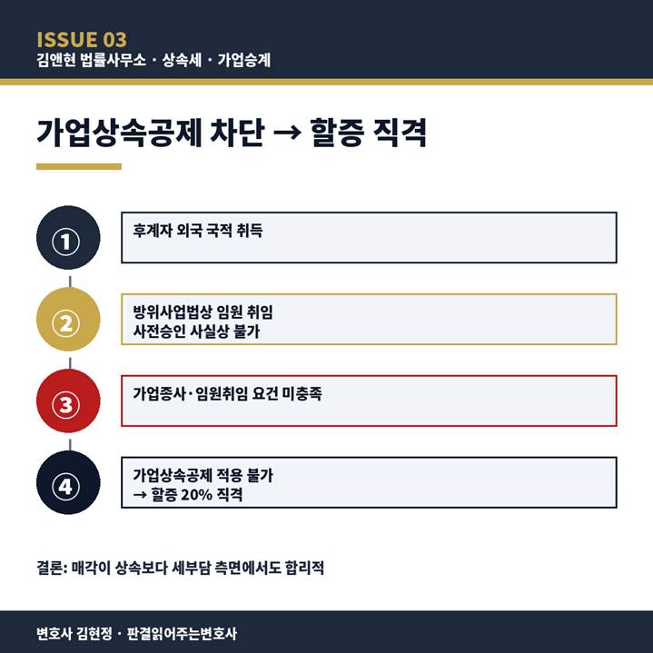 [도식 3] 후계자 외국 국적 → 가업상속공제 차단 → 할증 직격