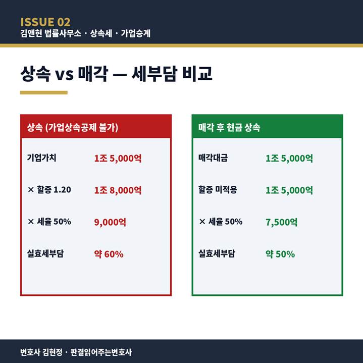 위 비교에서 명확히 드러나듯, 사업 자체를 상속하는 경우에는 최대주주 할증 20%가 평가단계에서 가산되어 약 3,000억 원 상당의 추가 과세표준이 형성되고, 그 결과 매각 후 현금 상속과 비교할 때 약 1,500억 원 수준의 세부담 차이가 발생합니다. 즉, 최대주주 할증평가 제도는 그 자체로 ‘사업을 물려주지 말고 매각하라’는 강력한 경제적 신호를 보내는 구조로 작동합니다.