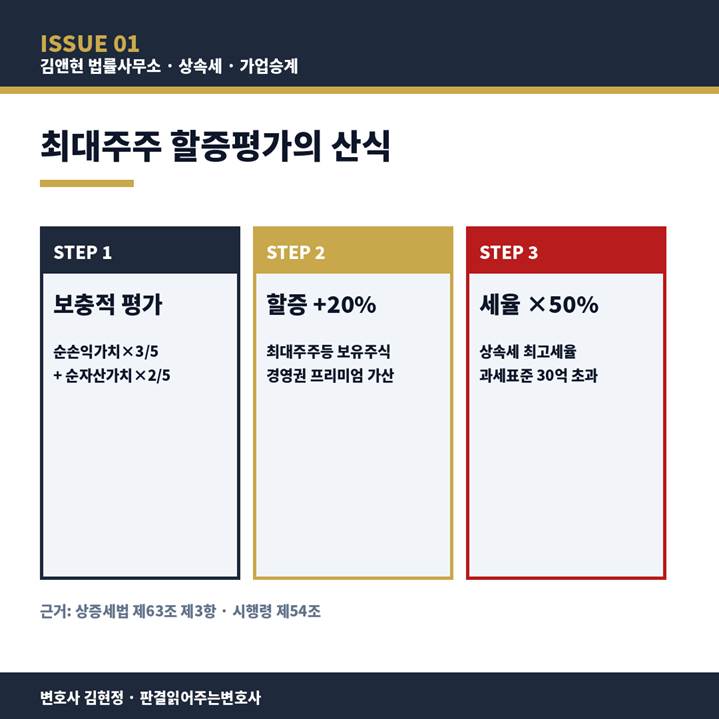 최대주주 할증이 가산된 평가액은 「상속세 및 증여세법」 제26조의 누진세율 구조에 따라 과세표준 30억 원 초과 부분에 대하여 50%의 최고세율이 적용됩니다. 결국 보충적 평가 → 할증 20% → 세율 50%라는 3단계가 연쇄적으로 작용하며, 그 결과 사업가치의 상당 부분이 상속세로 귀속되는 구조가 만들어집니다.
