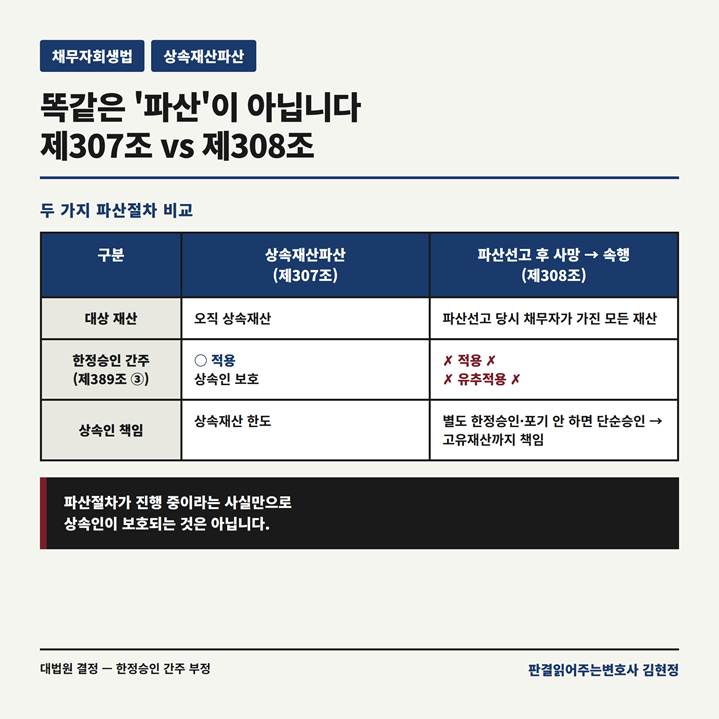 [도식 2] 두 가지 파산절차 비교 — 한정승인 간주 여부의 결정적 차이
