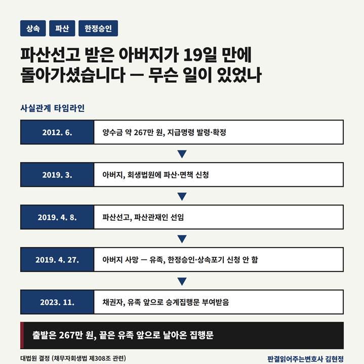 그런데 그 후 파산절차가 비용 부족으로 폐지되었고, 무려 4년이 지난 시점에 채권자가 처음의 그 지급명령을 들고 다시 등장하여 유족들 앞으로 승계집행문을 부여받았습니다. 그 결과 유족들은 단순승인을 한 상속인의 지위에 서게 되어, 상속받은 재산뿐 아니라 본인들의 고유재산으로도 망인의 채무를 변제할 책임에 노출되었습니다.